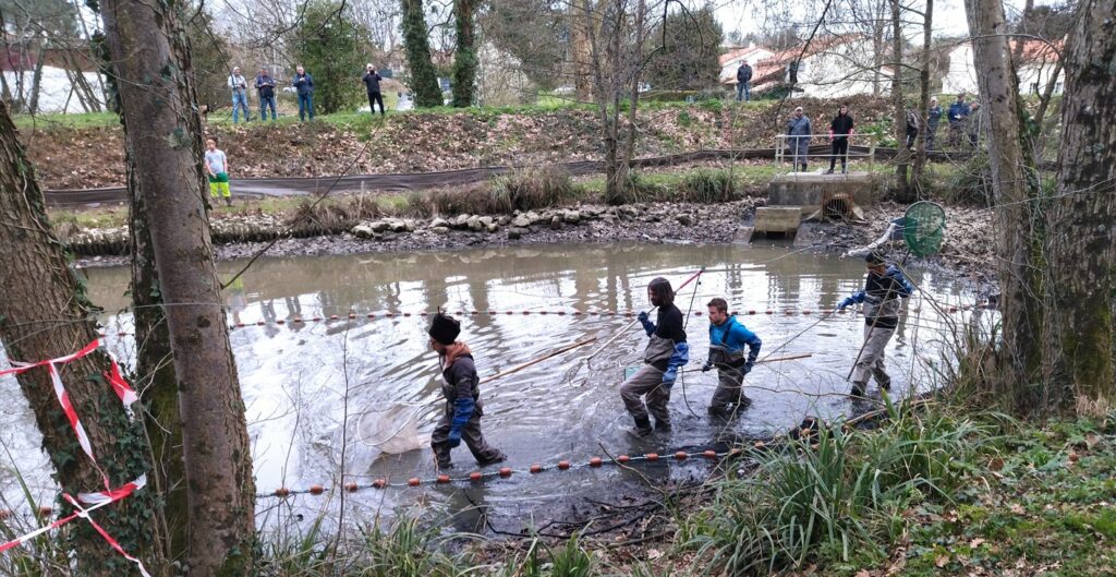 Après vidange encadrée durant plusieurs semaines, la hauteur d’eau restante permet la pêche à la senne puis la récupération du poisson serré dans le filet.