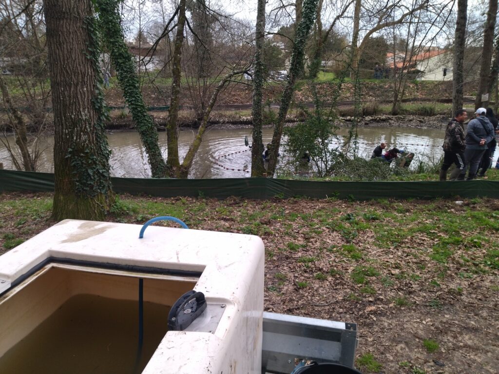 Les poissons sont ensuite transportés dans les cuves sous oxygène vers leur nouveau lieu de vie (un autre étang assez proche appartenant aussi à la fédération de pêche).